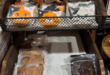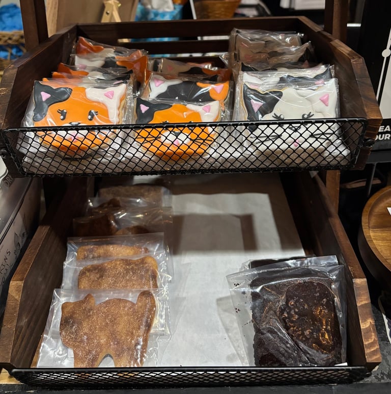 We offer a small selection of fresh baked treats from local bakery Pizelle Bakes, as well as decorated cat shortbread cookies, chips & granola bars.
